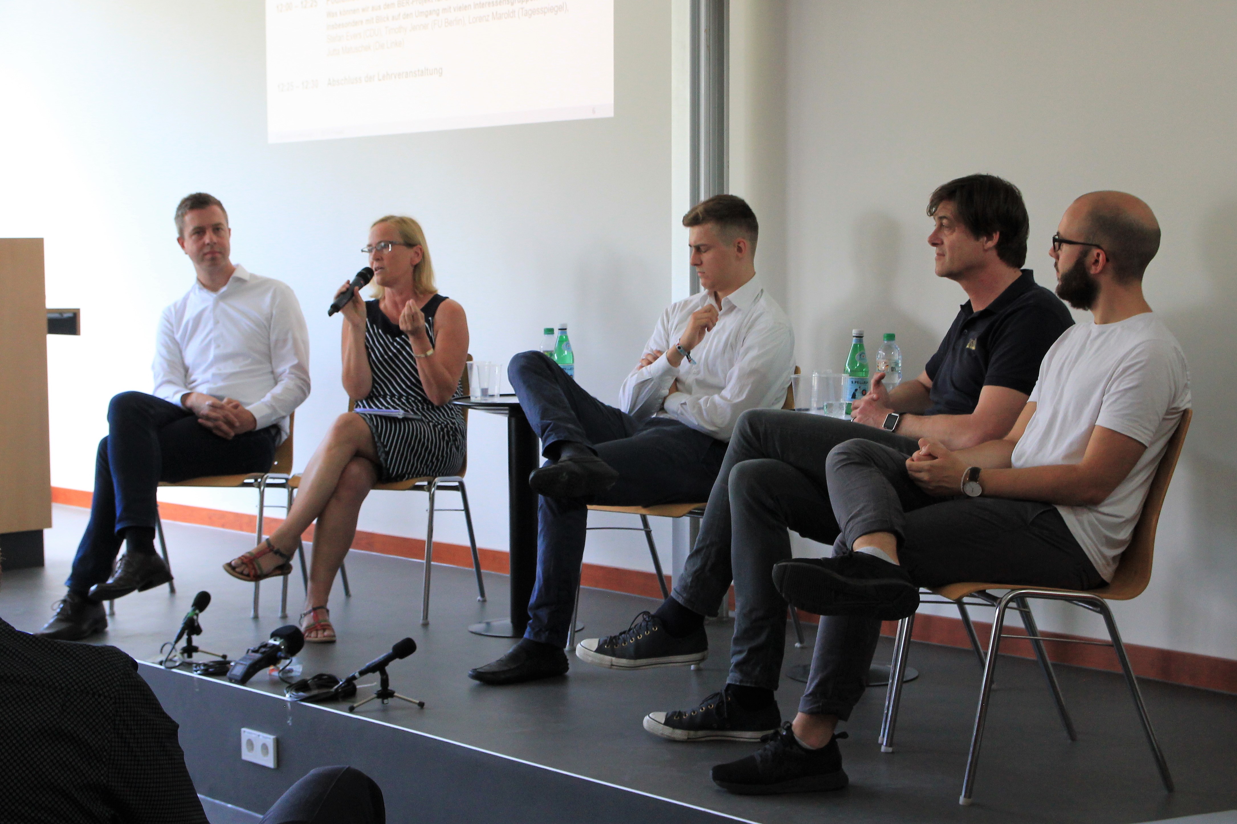 So stellten sich zum Beispiel der ehemalige Planer der Brandschutzanlage des BER Alfredo di Mauro und der frühere Bauplaner und Architekt Dieter Faulenbach da Costa den Fragen der Studierenden. Auch politische Ansprechpartner standen dem Projekt als Experten zur Seite: Stefan Evers von der CDU, Harald Moritz von Bündnis 90/Die Grünen, Sebastian Czaja von der FDP und Martin Delius von den Linken folgten der Einladung. Lorenz Maroldt, Chefredakteur des Tagesspiegels, und Michael Fabricius von der Zeitung Die Welt begleiten das Projekt ebenfalls.