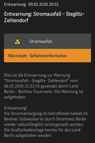 Am Samstag, den 3. Januar 2026, kam es im Südwesten Berlins zu einem massiven Stromausfall: Die Ortsteile Nikolassee, Wannsee, Zehlendorf und Lichterfelde im Bezirk Steglitz-Zehlendorf waren bei winterlichen Wetterverhältnissen über 4,5 Tage weitestgehend ohne Strom. Der Betreiber Stromnetz Berlin meldete, dass mehr als 45.000 Haushalte und über 2.000 Gewerbekunden betroffen waren. Ursache war ein Brand in einer Verteilerstation bzw. an einer Kabelbrücke in Lichterfelde, bei dem mehrere Kabel beschädigt wurden und die Stromversorgung zusammenbrach. Schon früh gingen Ermittler von einem Brandanschlag aus, der zeitgleich von einer linksextremistischen Gruppierung im Internet in einem Bekennerschreiben für sich reklamiert wurde. Anschläge oder Sabotageakte auf die Berliner Verkehrs-, Energie-, oder Telekommunikationsinfrastruktur sind seit den letzten fünf Jahren gehäuft zu beobachten, erst im September 2025 wurden zwei Strommasten im Südosten Berlins mutwillig beschädigt und ließen ca. 50 000 Personen für ca. 2,5 Tage ohne Strom (rbb24).