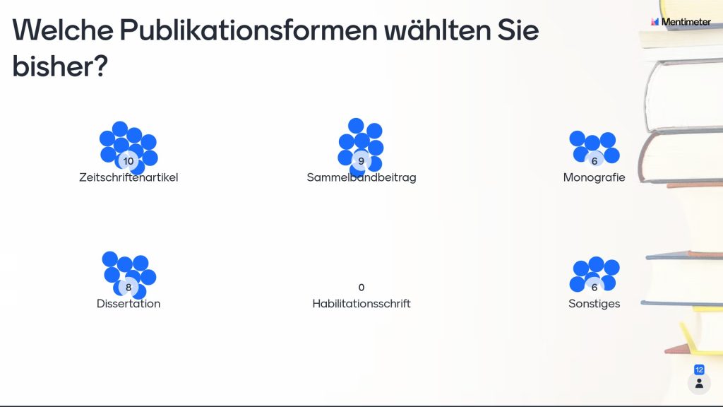 Der thematische Workshop ist Teil des Projektangebots von open-access.network und wurde gemeinsam von dem Open-Access-Büro Berlin und dem Fachinformationsdienst Politikwissenschaft (Pollux) ausgerichtet. Neben einer Einführung zu Möglichkeiten verschiedener Publikationswege und Services von Infrastrukturbetreibenden, konnten die knapp 30 Teilnehmenden in einen direkten Austausch mit zwei Open-Access-Publizierenden gehen.