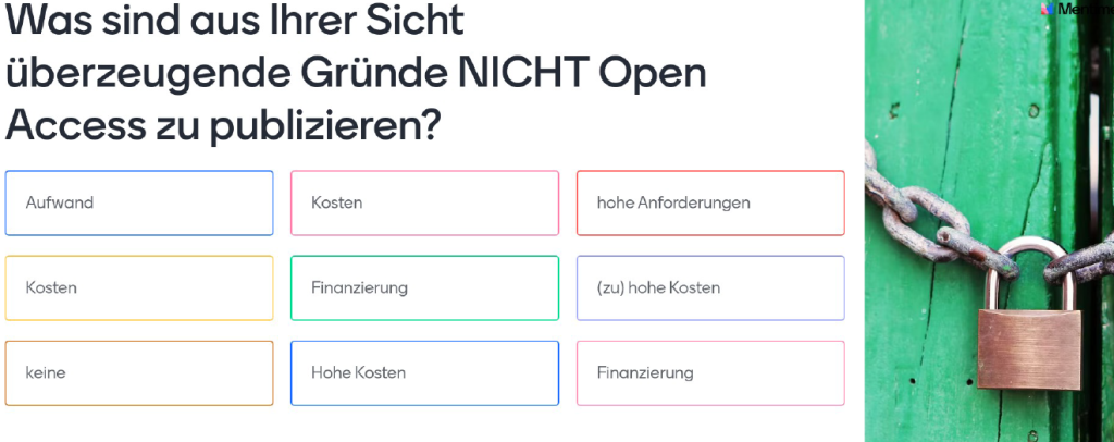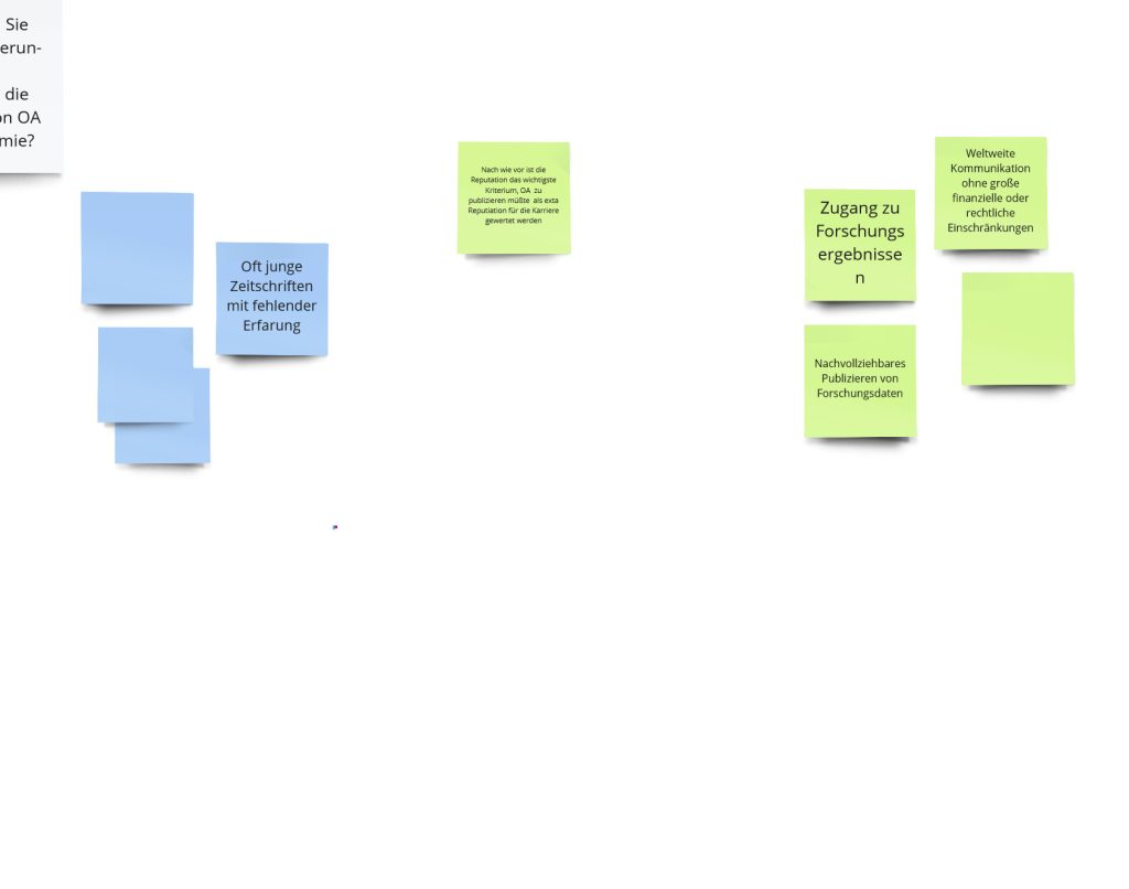 Gemeinsam deckten die Wissenschaftler*innen über den Workshop hinweg Bedarfe, Fragen und Herausforderungen auf: Die Erhöhung der Transparenz stehe neben dem Wunsch einer unkomplizierten Finanzierung der eigenen Publikation. Einige Aussagen betrafen Daten- und Open-Access-Publikationen: Es werde ein Qualitätssicherungsprozess benötigt. Dieser sollte aus der wissenschaftlichen Community heraus gestaltet werden und dem Bild eines unkontrollierten Massenpublizerens vorbeugen.