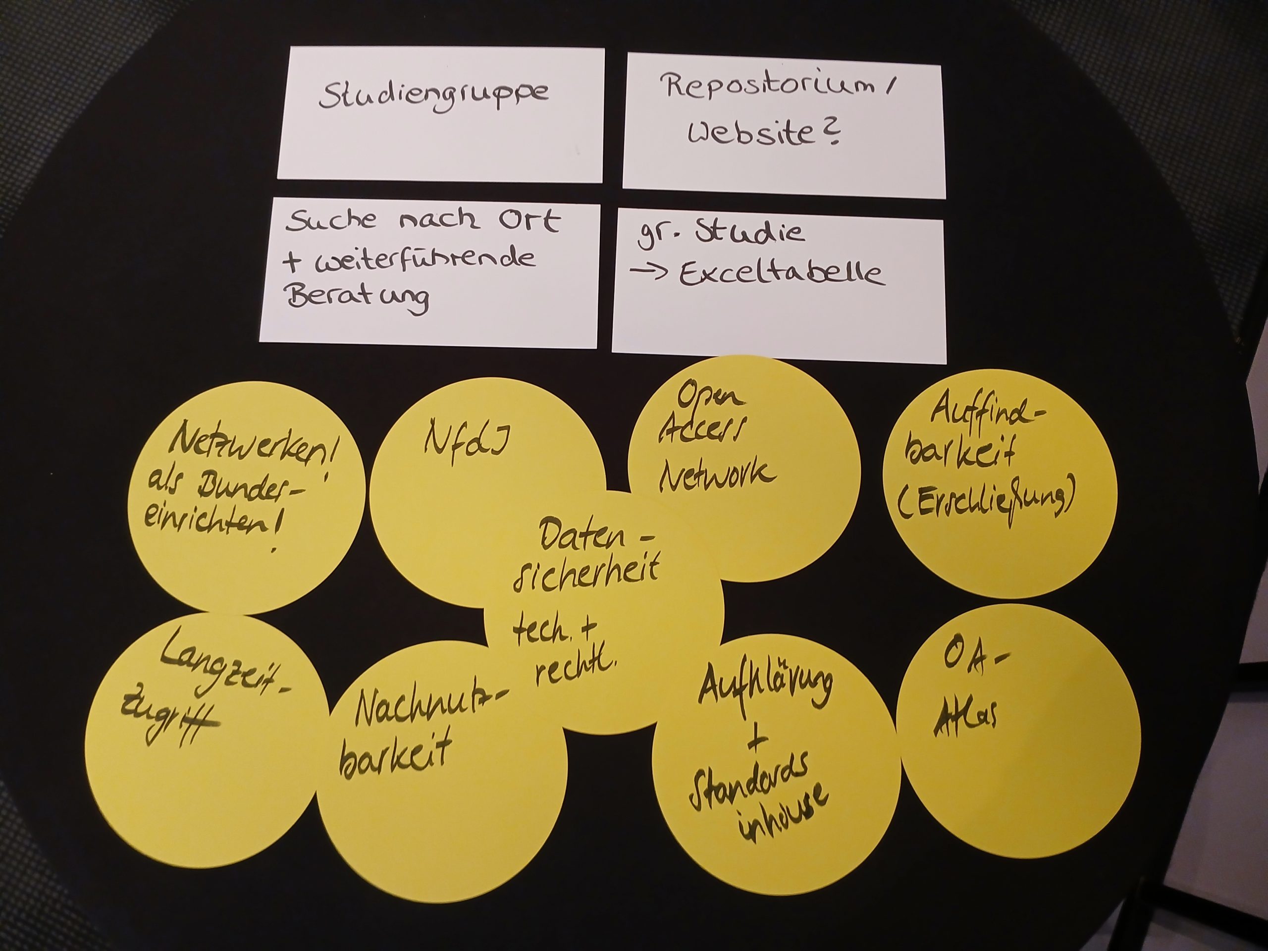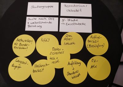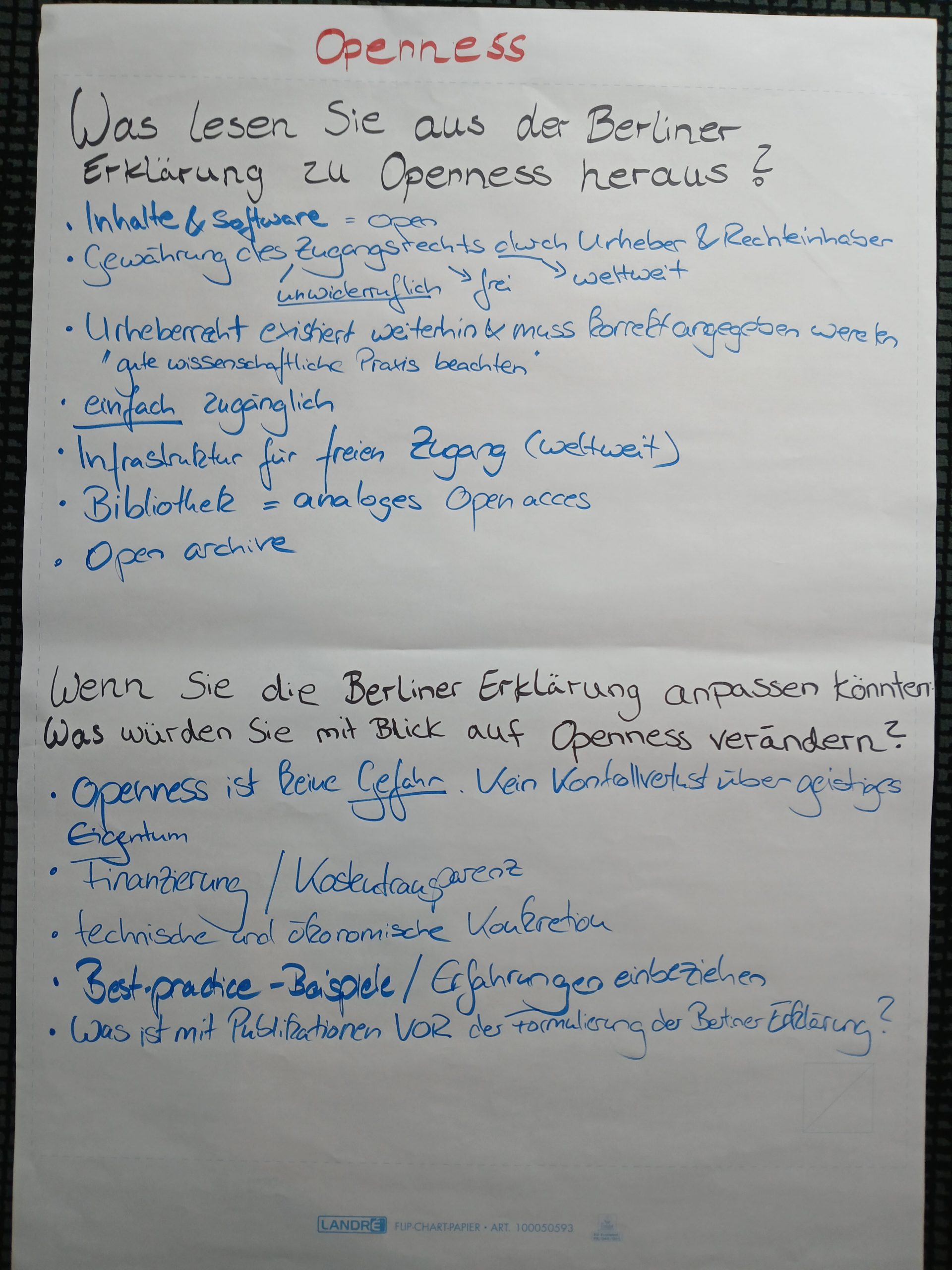 Linda Martin (Open Research Office & open-access.network) und Friederike Kramer (Universitätsbibliothek der Universität der Künste) boten gemeinsam das Hands-On Lab „Gut beraten: Open Access ist (k)eine Herausforderung“ an. Der Workshop richtete sich an Interessierte, die zu den Themen offene Wissenschaft und Open Access beraten. Um die über die Jahre veränderten Bedarfe aus Forschung und Wissenschaft zu reflektieren, beleuchteten die Interessierten die Berliner Erklärung kritisch in Sachen Openness, Publikationsorte und Publikationsarten. Anschließend diskutierten die Teilnehmenden in einer Peer-to-Peer-Beratung Erfahrungen aus ihrem Beratungsalltag. Die Erkenntnis aus dem Hands-On-Lab: Beratung ist eine gemeinsame Aufgabe, die sich vor allem durch Kommunikation und Vernetzung lösen lässt. Weitere Pinnwand-Erkenntnisse sind auf einem zweiten Foto dokumentiert.