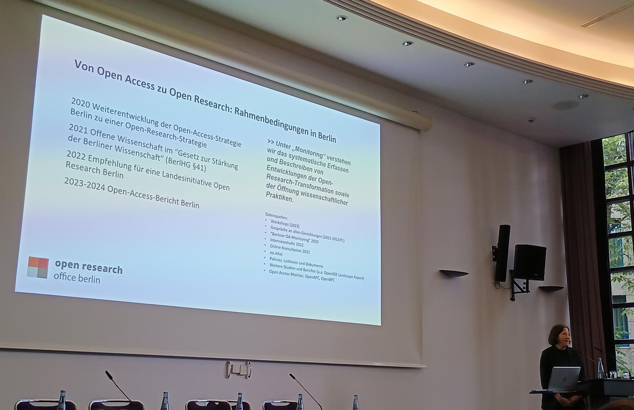 Maike Neufend präsentierte zusammen mit Ben Kaden (Vernetzungs- und Kompetenzstelle Open Access Brandenburg) und Doreen Rocholl (Landesinitiative openaccess.nrw) einen Input zu der Frage „Wie können Hochschulbibliotheken von Open-Access-Landesinitiativen profitieren? Erfahrungen und Good Practices“. Landesinitiativen für offene Wissenschaft sind ein Steuerungsansatz zur Gestaltung und Begleitung der Open-Access-Transformation. Die drei Landesinitiativen gaben einen Einblick in drei Good Practices, die rechtliche Beratung zu Open Access in Nordrhein-Westfalen, einen Publikationsfonds für Monografien in Brandenburg und das kontextsensible Monitoring und Reporting der Open-Research-Transformation am Beispiel des Open-Access-Berichts Berlin (2024). Am Ende warfen die Landesinitiativen noch einen Blick auf die Netzwerkeffekte, Effizienzeffekte und Wissenseffekte, die Landesinitiativen in Zusammenarbeit mit Hochschulen und wissenschaftlichen Bibliotheken befördern.