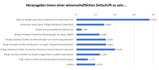 Die Integration redaktioneller Arbeit in die Leistungsbewertung wissenschaftlicher Tätigkeiten stellt einen weiteren interessanten Aspekt der brasilianischen Erfahrung dar und kann auch als Vorbild etwa für Deutschland dienen. In Brasilien umfassen Auswahlverfahren für akademische Stellen und Stipendien Kriterien, die über die reine Publikationsleistung hinausgehen. Dabei kann die Mitwirkung an akademischen Aktivitäten wie der Betreuung von Abschlussarbeiten, der Teilnahme an Prüfungskommissionen oder auch an der Herausgabe wissenschaftlicher Zeitschriften bei der Bewertung positiv und nach quantitativ messbaren Kriterien berücksichtigt werden. Zur Frage nach den konkreten Vorteilen der Tätigkeit als Editor einer DOA-Zeitschrift haben im Durchschnitt etwa 30 % der Befragten meiner Studie eine der Antworten gewählt, die messbare Punktzahlen in Auswahlprozessen im Wissenschaftsbetrieb explizit nennen. Aber auch wenn Editors keine direkten Vorteile daraus ziehen, erhöht die redaktionelle Tätigkeit die akademische Reputation und wird offenbar als integraler Bestandteil wissenschaftlicher Arbeit angesehen.