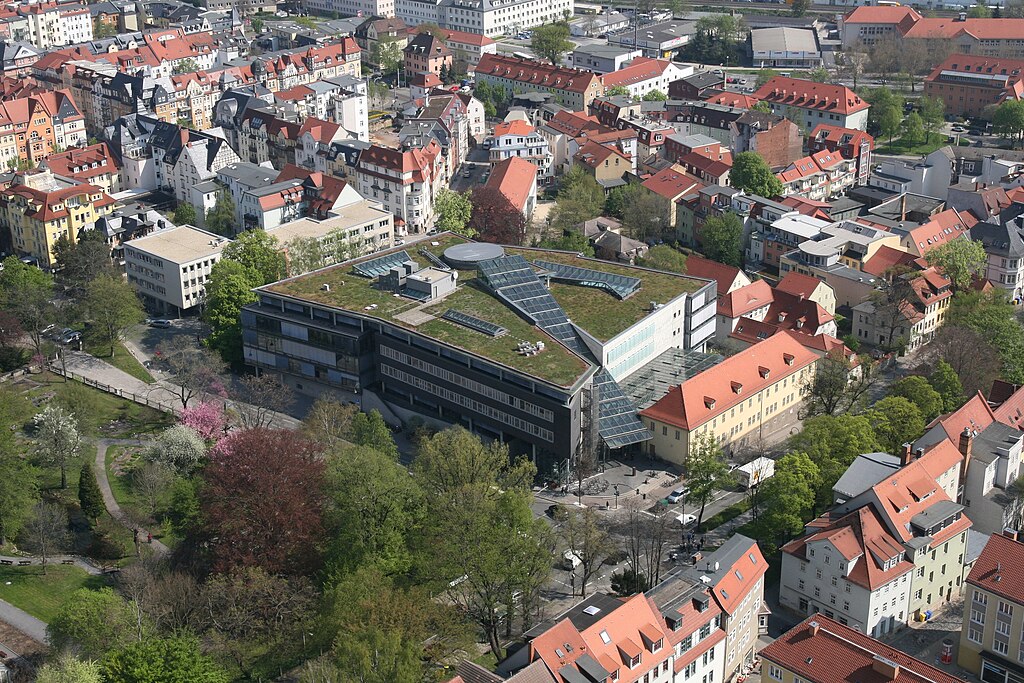 Das Gebäude der ThULB aus der Vogelperspektive. Tomukas – Thomas Holbach, CC BY-SA 3.0, via Wikimedia Commons