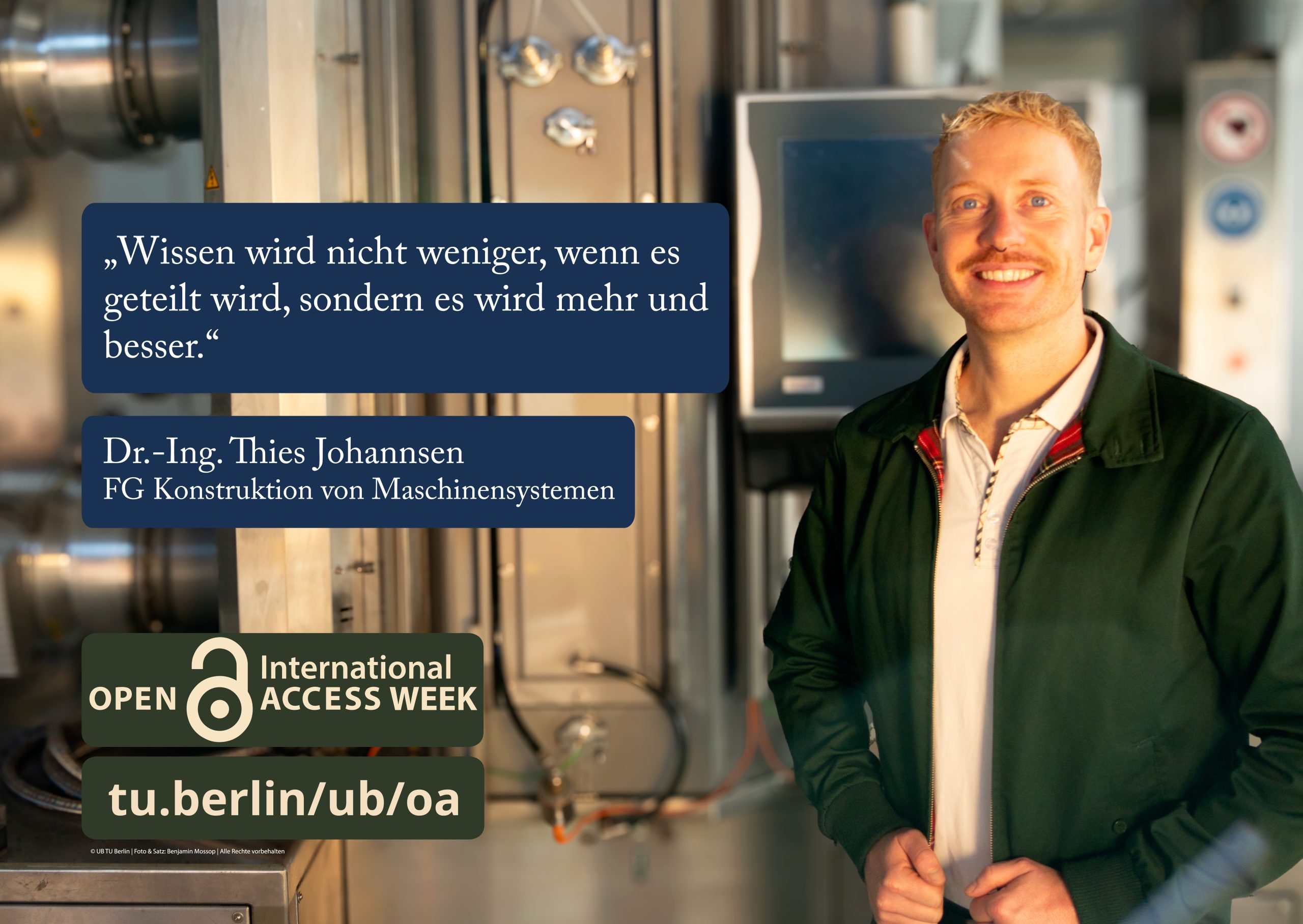 Den Auftakt macht in diesem Jahr Dr. Thies Johannsen vom Fachgebiet Konstruktion von Maschinensystemen der TU Berlin und Open Science Ambassador der Berlin University Alliance. Seiner Ansicht nach trägt Open Access dazu bei, dass wissenschaftliche Erkenntnisse nicht nur breiter zugänglich, sondern auch besser und sozial robuster werden. Er plädiert dafür, dass Open Access zur wissenschaftlichen Praxis gehören sollte, wie auch gute wissenschaftliche Standards.