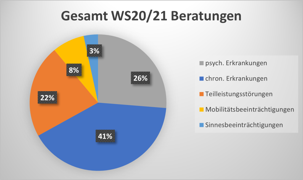 Übersicht über die Verteilung der Beeinträchtigungen der Studierenden, die im Wintersemester 2020/21 die Beratung in Anspruch nahmen
