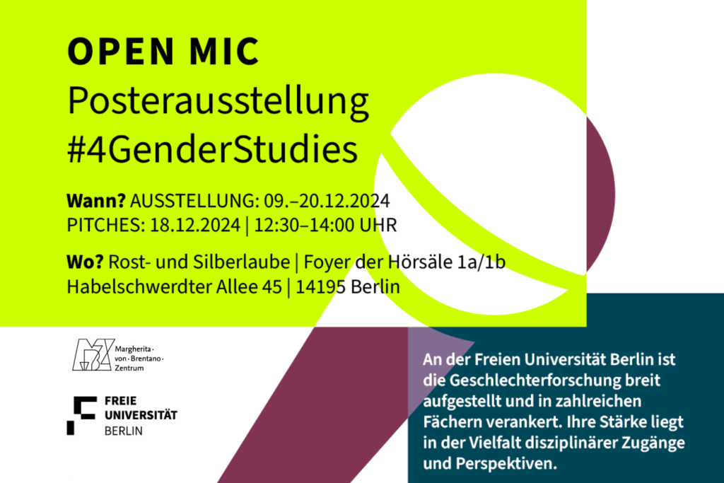 Für den diesjährigen Wissenschaftstag #4Gender Studies hat das Margherita-von-Brentano-Zentrum für Geschlechterforschung Promovierende, Postdocs und Wissenschaftliche Mitarbeiter*innen der Freien Universität Berlin dazu eingeladen, ihre Forschung im Rahmen einer Posterausstellung zu präsentieren. Zusammengekommen sind 11 spannende Poster aus unterschiedlichen Disziplinen, die vom 9.-20. Dezember im Foyer der Hörsäle 1 A/1 B in der Rost- und Silberlaube ausgestellt werden.